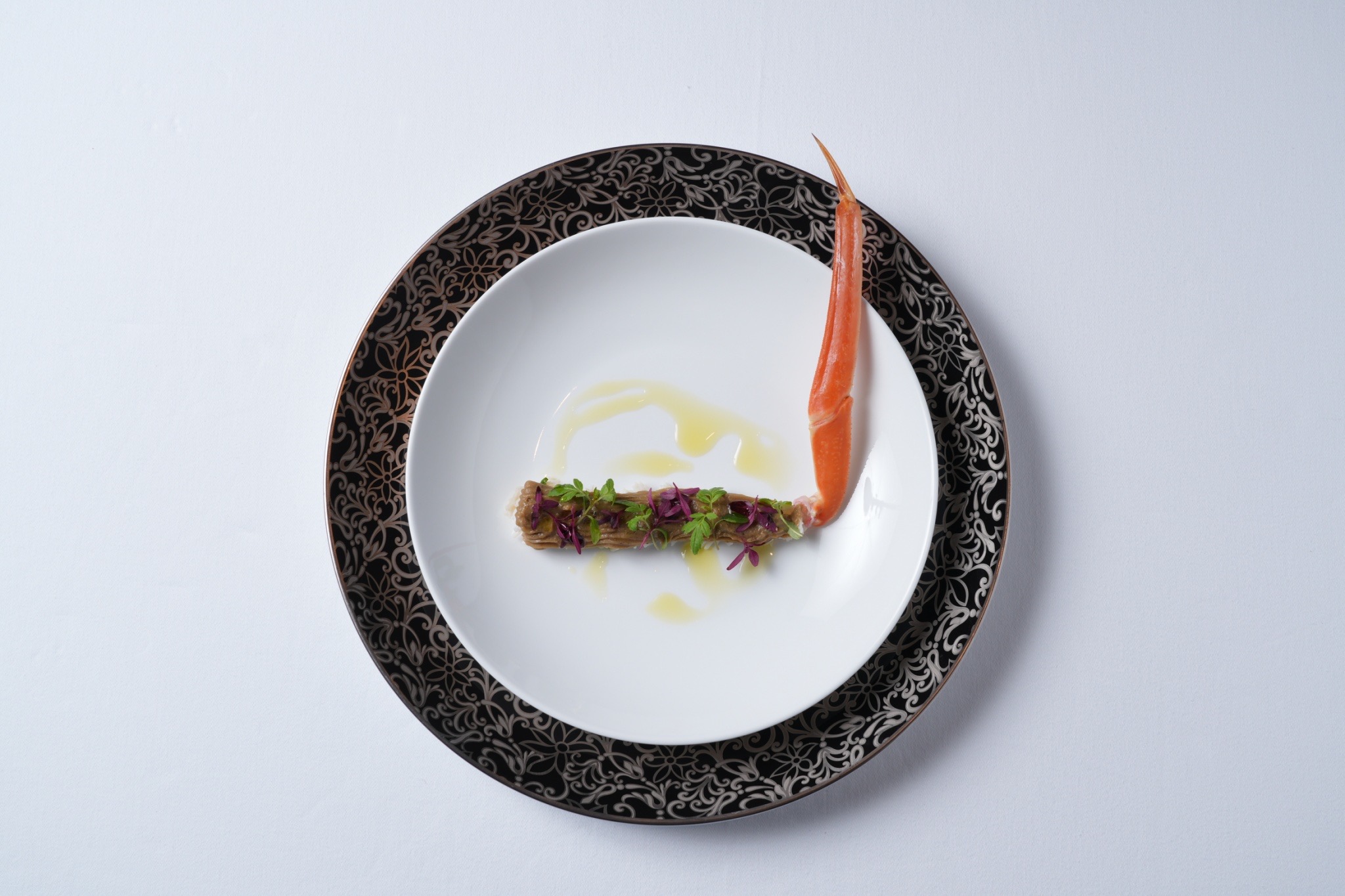 écume en oursin 六条大麦と蟹の温かいサラダ 汐ウニ風味のエキューム - Crabe d’Echizen poché dans un consommé de crustacés, Sauce au corail de crabe aux herbe et pafrfumée au chardon 越前がに 炭の香りをつけたみそ焼き